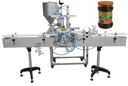 双头直线酱料灌装机/豆豉酱灌装机是星火公司专门针对香辣酱、豆豉酱进行定量灌装的一种新型灌装设备,在使用上分为自动香辣酱装机和半自动香辣酱装机两种,其中半自动机型需要人工放瓶、可以选择AUTO灌装和FOOT灌装,然后结合台式旋盖机旋盖、半自动贴标机进行贴标,而自动双头辣椒酱灌装机一般是配合自动旋盖机、浆糊贴标机等设备一起使用,从而构成一套灌装流水线。